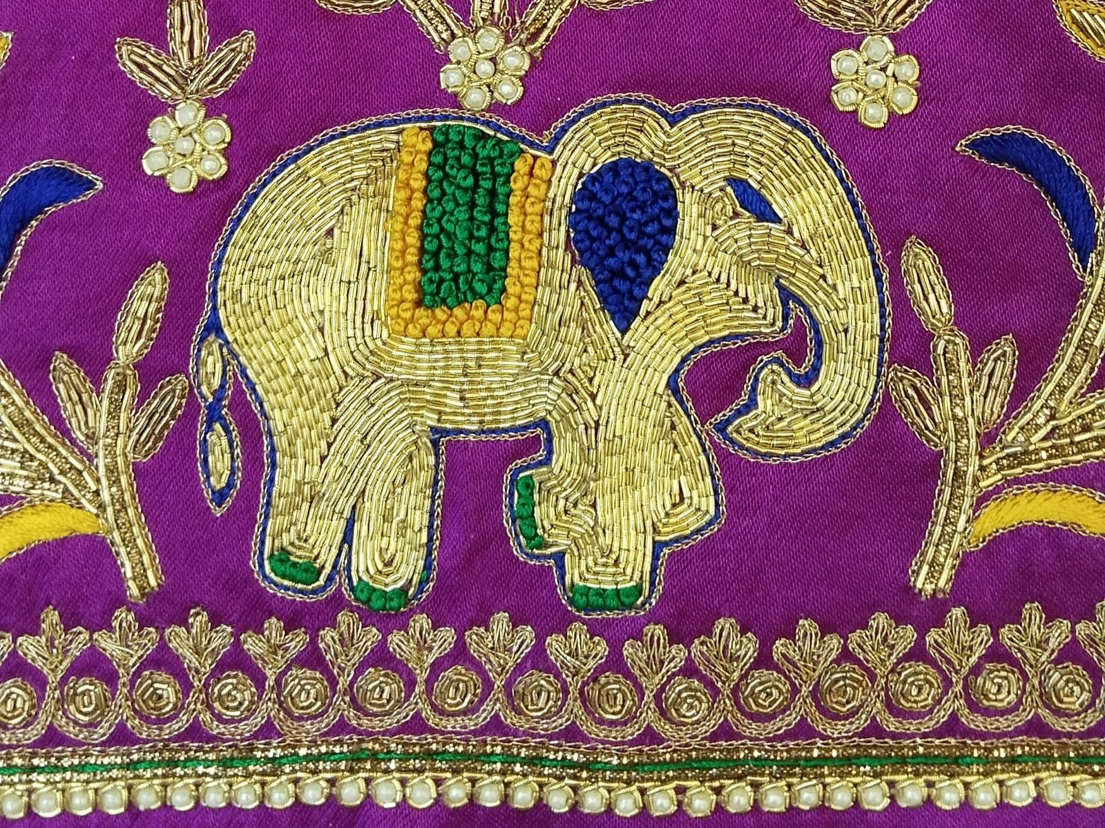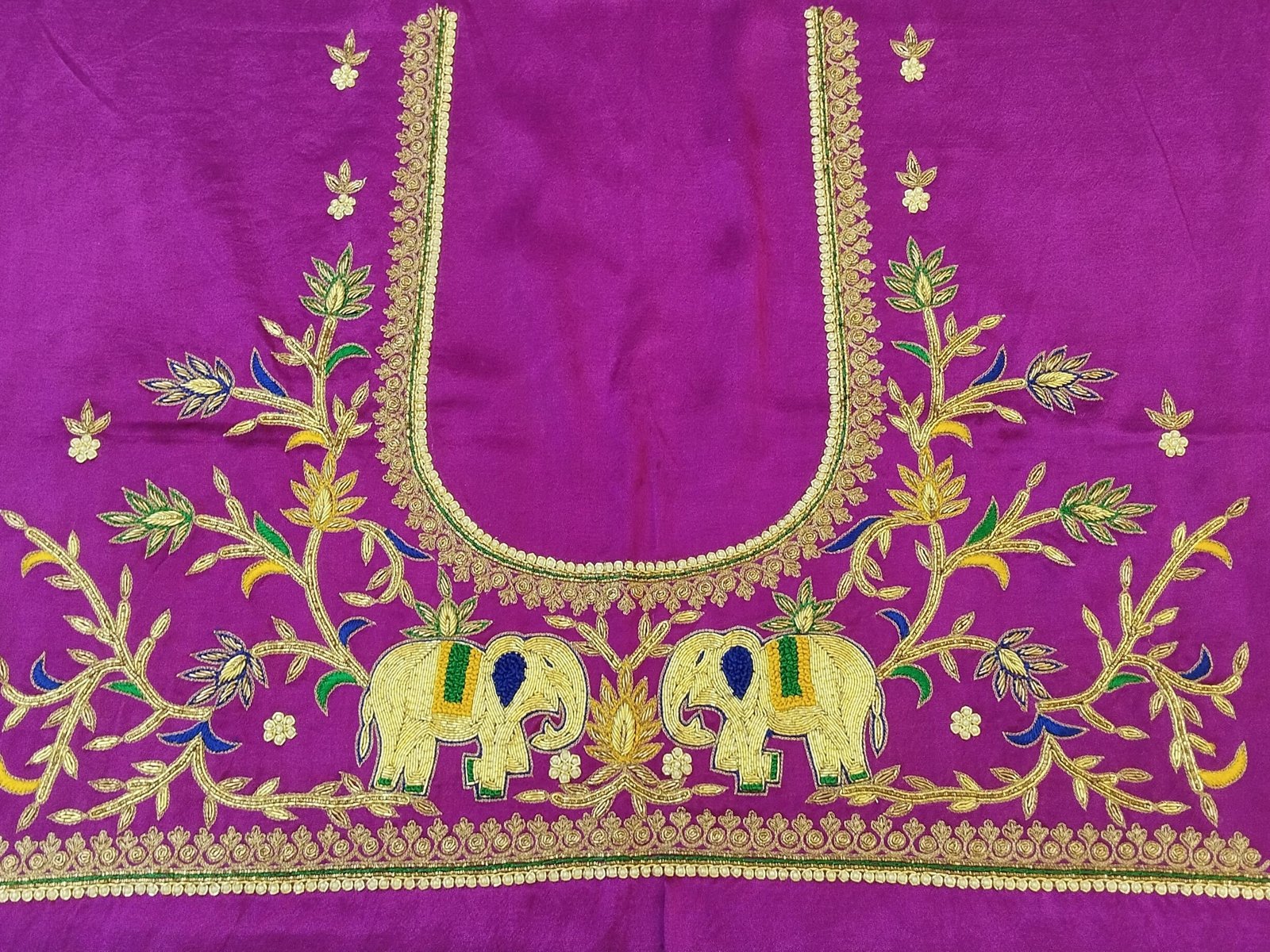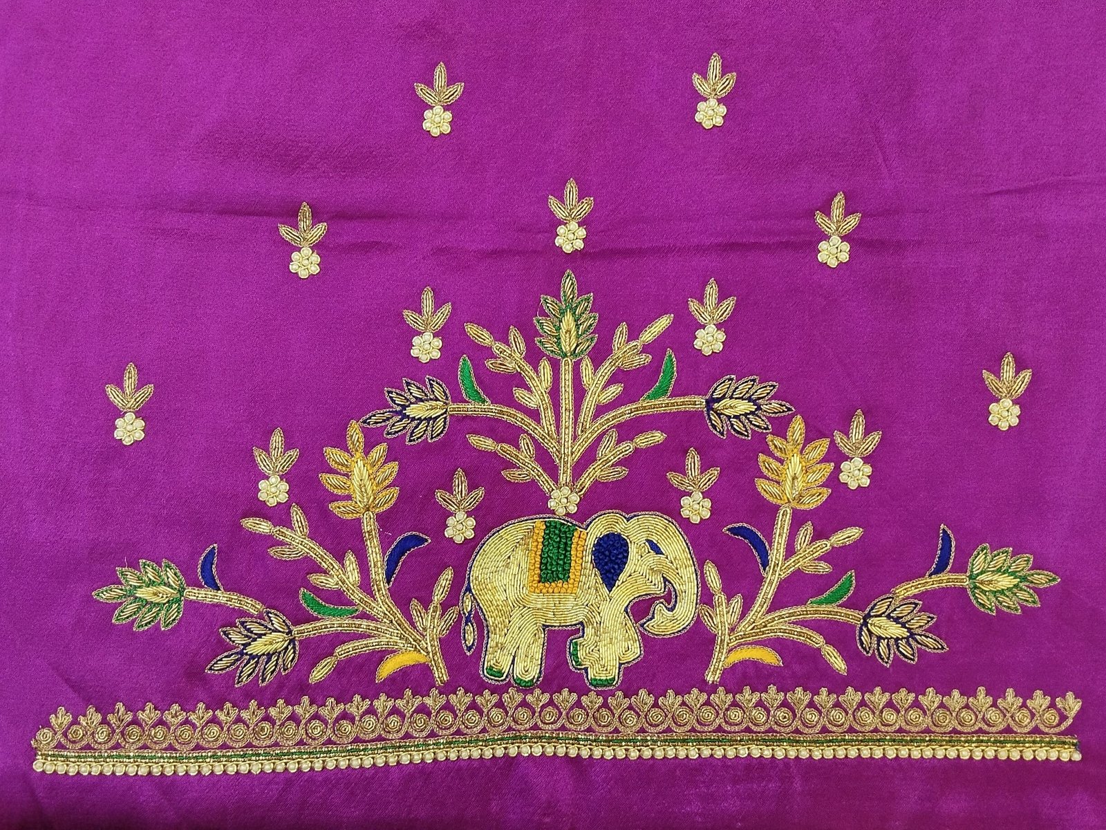 Embrace the majestic allure of the elephant zardozi work blouse pis, fit for a queen. The intricate Zardozi work depicting elephant motifs adds an elegant touch to the blouse, exuding regal charm. Crafted from premium gaji silk, the blouse offers a luxurious and comfortable fit, perfect for formal occasions or special events. Let the elephant -inspired design take flight and make a statement.