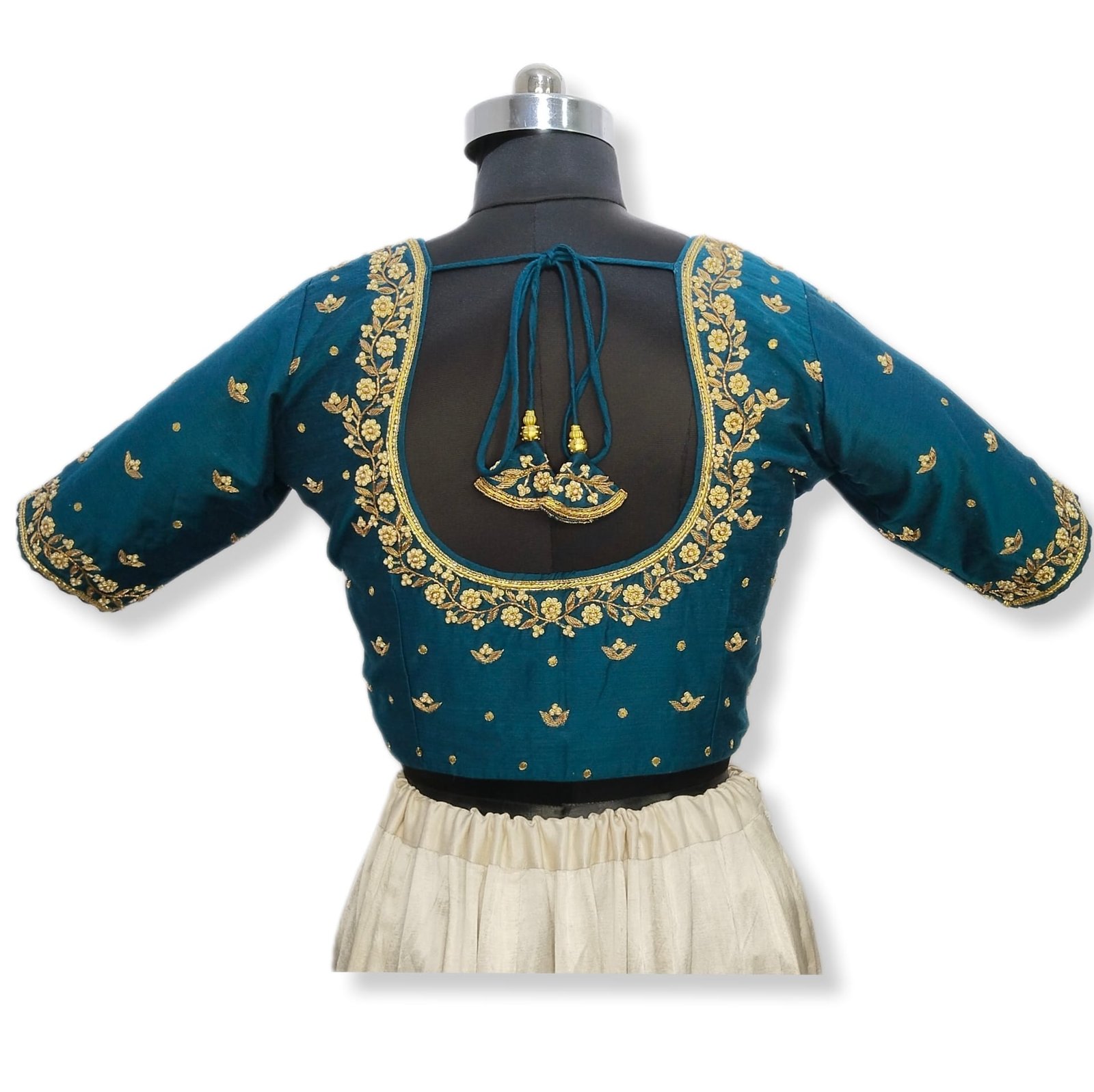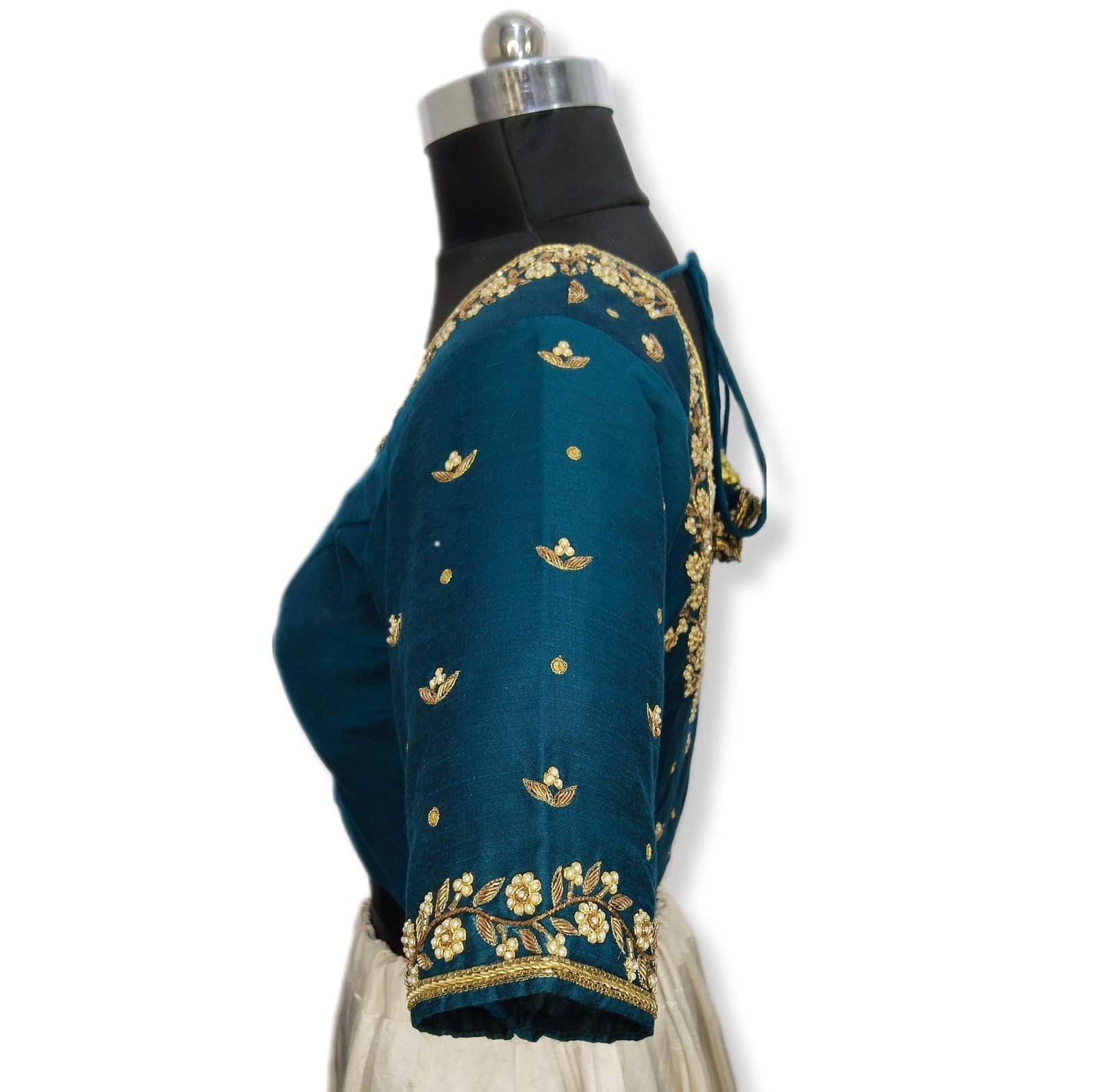 Embrace the majestic allure of the perl & zardozi zardozi work designer Blouse, fit for a queen. The intricate Zardozi work depicting peacock motifs adds an elegant touch to the blouse, exuding regal charm. Crafted from premium semi-raw silk, the blouse offers a luxurious and comfortable fit, perfect for formal occasions or special events. Let the perl-inspired design take flight and make a statement.